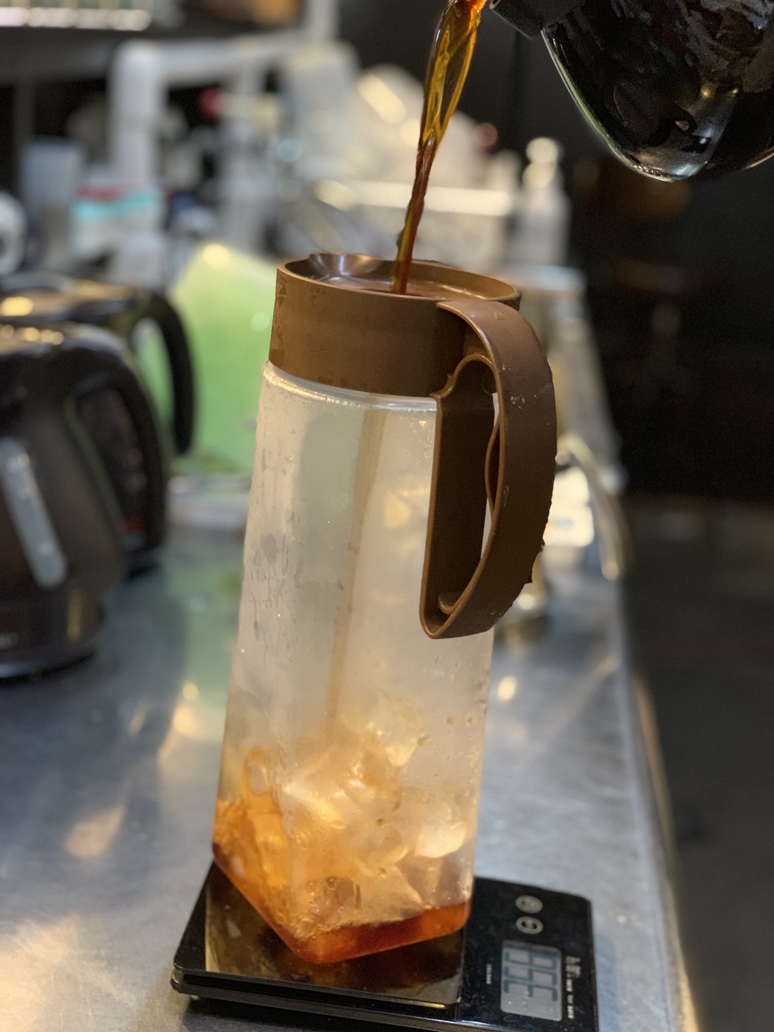 出来上がった珈琲は熱いので氷で冷やしていきます。