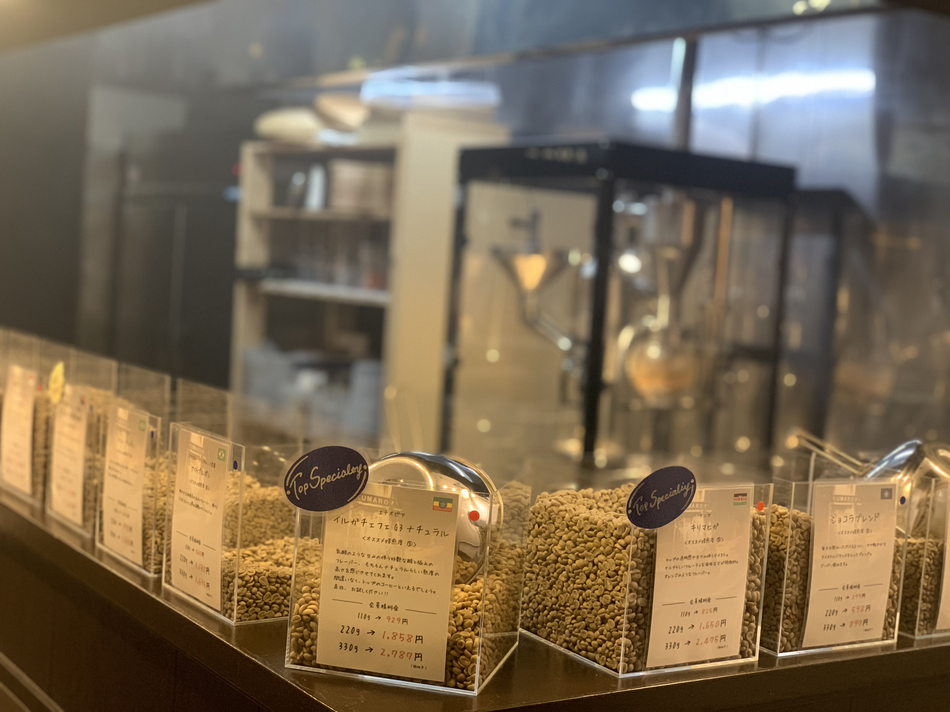 豆は、約30種類ほどの生豆を置いてあり、その場で焙煎し販売しております。